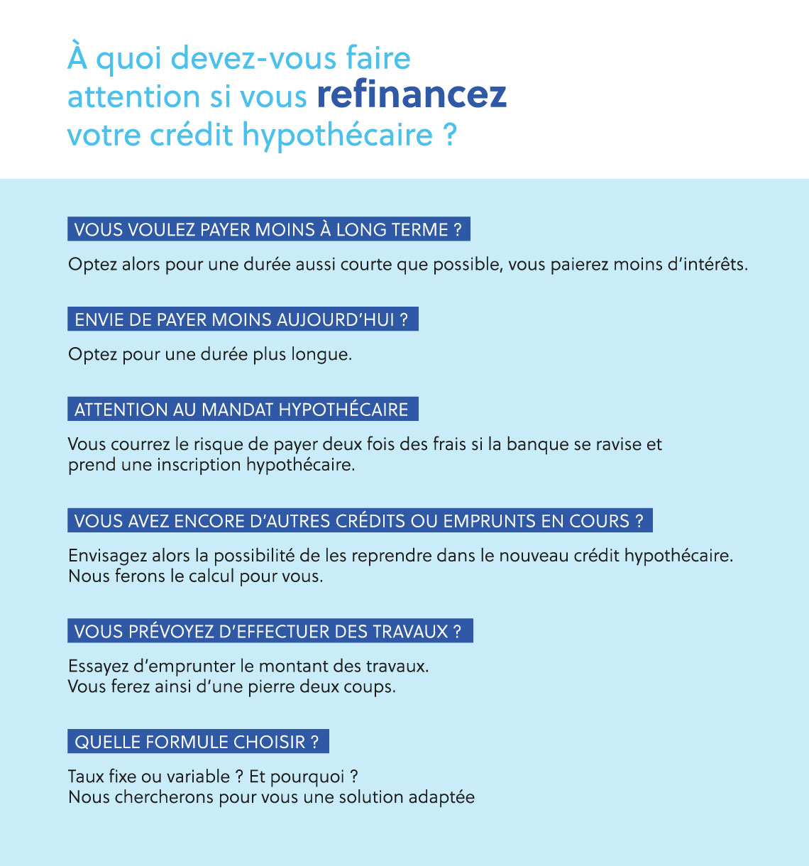 Ci-dessous nous vous montrons à quoi vous devez faire attention si vous envisagez à refinancer votre prêt? Avez-vous encore des questions? N'hésitez pas à nous contacter. Nous vous aiderons avec plaisir.